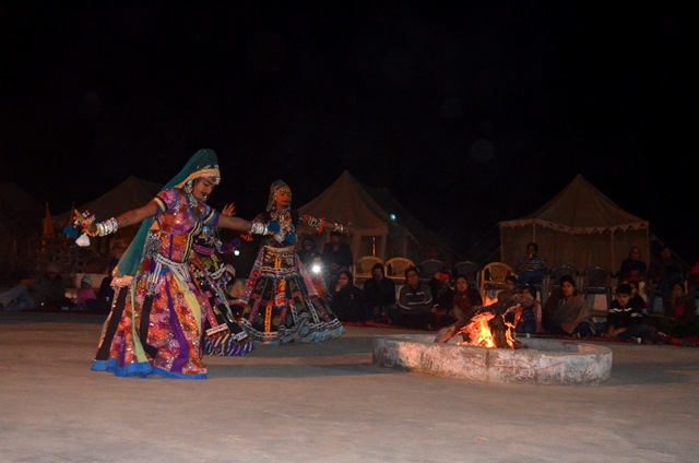 From 3.00 PM to 10.30 PM Transport from Jaisalmer To sam sand dunes (if you hire a car for transport than vehicle charge will be extra) Visiting Monuments in kuldhara ‘’A HORROR VILLAGE ‘’ Reached at desert and do Camel Riding and watch Sunset over Dunes Jeep safari for half an hour on dunes.( price not inclusive in package ) and return back to camp Welcome Drinks ( Tea/Coffee and snacks ) after that Rajasthani Cultural programme, Folk dance, Music, and Group Dance on DJ around camp fire. Buffer Dinner ( Pure Veg. ) Return back to Jaisalmer at 10.30 PM.